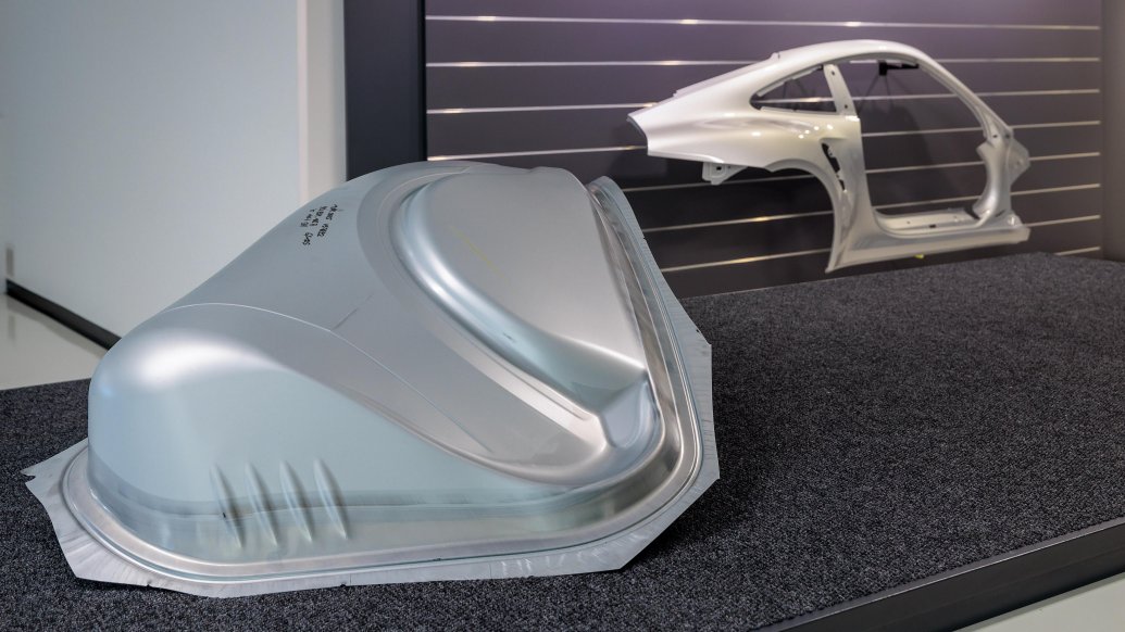 Bir Porsche'nin duygusal tasarımı için gerekli gövde bileşenleri, otomotiv endüstrisindeki en zorlu dış kaplama bileşenleri arasındadır. Örneğin, belirgin çamurluklar, alçak uçuş çizgisi veya bir 911 Turbo'nun özellikle geniş arka kısmı kadar Porsche DNA'sının bir parçasıdır. Güçlü konturlar, yani heykelsi görünüm, geniş girintiler gerektirir. Bu nedenle, yan panellerin, çamurlukların ve kaputların sac levhaları büyük ölçüde düz veya kıvrım yerlerinde eğimli değildir. Aksine, pres atölyesindeki şekillendirme süreci, içbükey ve dışbükey gövde şekillerinin etkileşimini ve açık kenarların heyecan verici konturlarını yakalamak üzere tasarlanmıştır