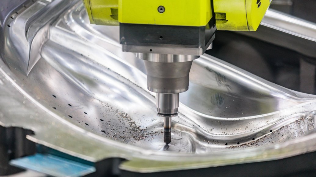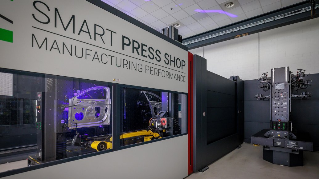 Alüminyum gövde parçalarının gerçek üretim süreci, birkaç ton ağırlığındaki rulolar halindeki alüminyum levhalarla başlar. Halle/Saale'deki Akıllı Pres Atölyesi'nde , yüksek performanslı presler önceden kesilmiş parçaları lazerle doğru şekle keserek gövdenin dış kaplamasını ve yapısal parçalarını üretir.